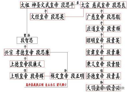 云南大理段氏段思平也就是大理太祖圣神文武帝,也是小说中“六脉神剑”“一阳指”“枯荣禅功”的创造者。《天龙八部》时期,大理的皇帝是保定帝段正明,后来是宪宗宣仁段和誉(又名正严),也就是“天龙三兄弟”中的段誉。
